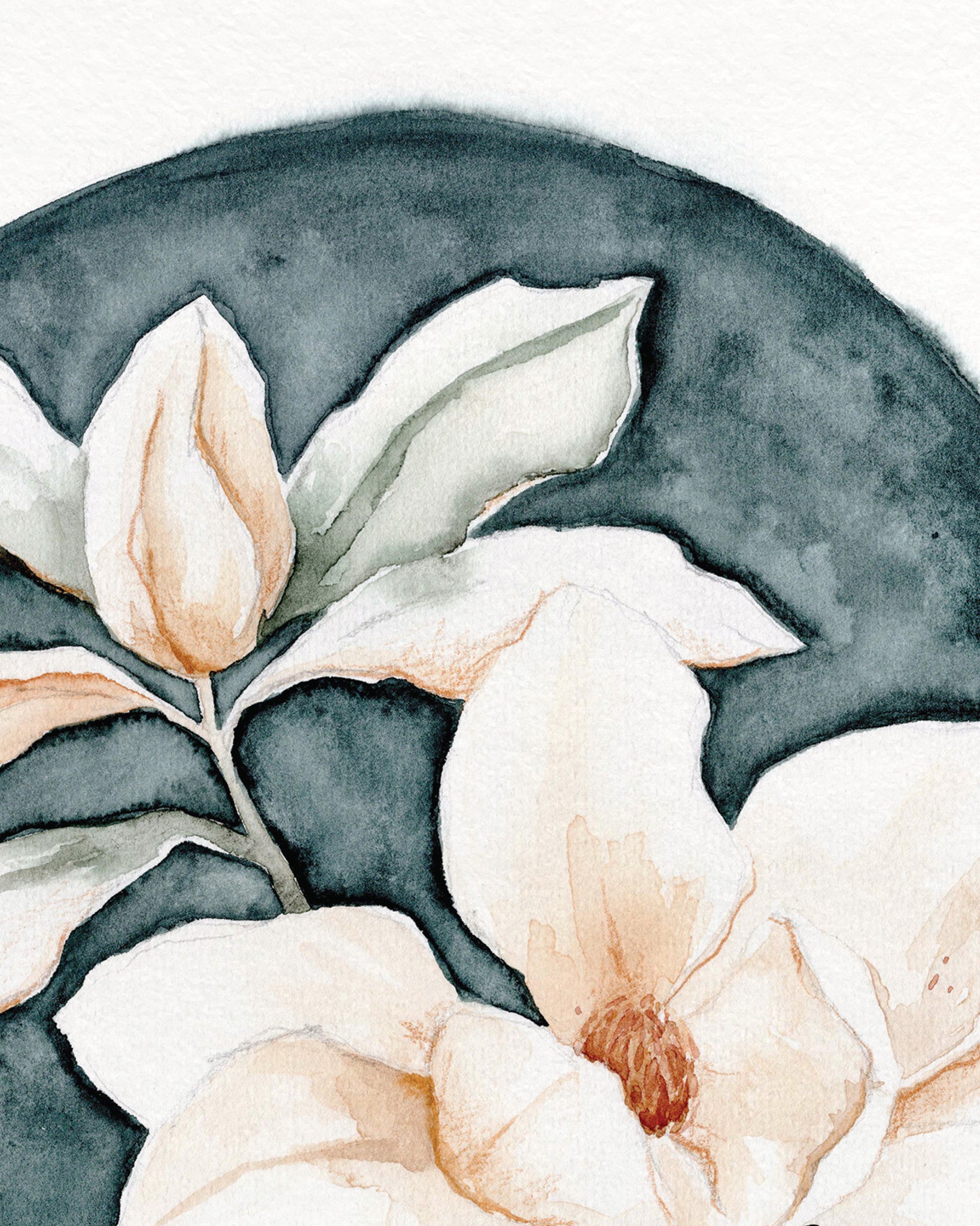 Originally painted in delicate watercolors, each petal and leaf is crafted with soft, flowing tones that evoke the natural grace of the magnolia bloom.