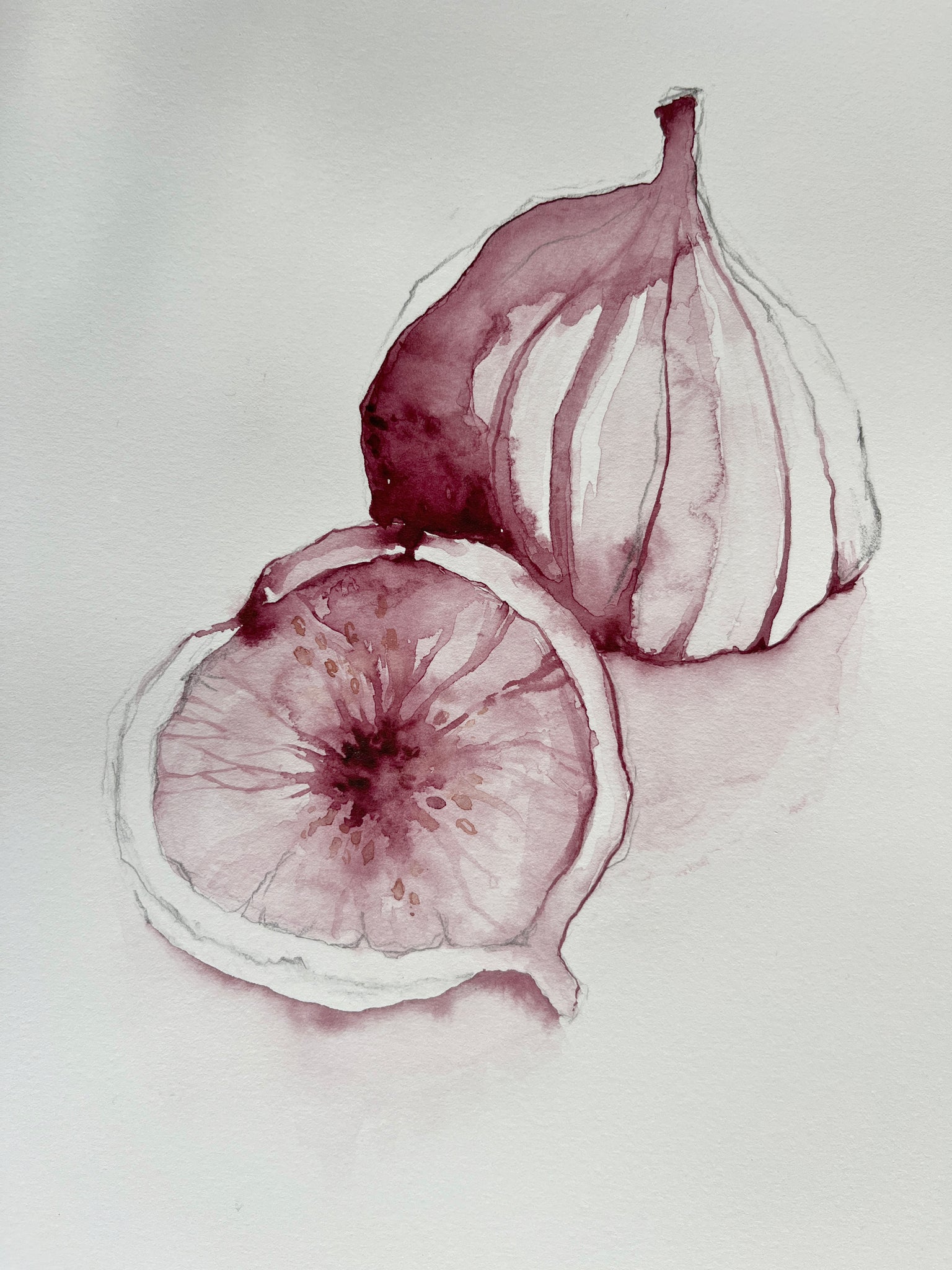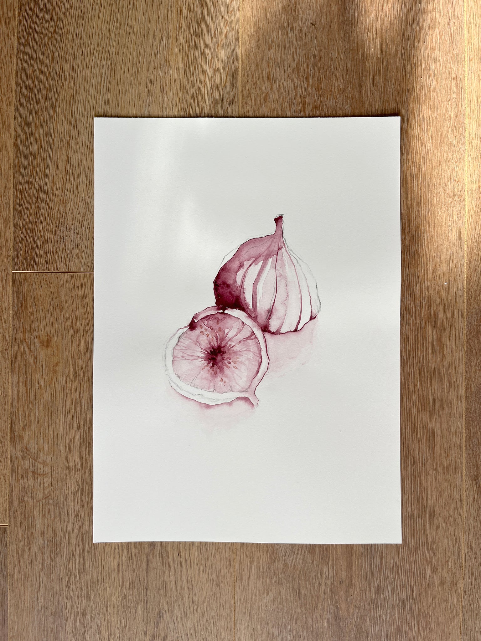 An original watercolor painting of beautiful purple figs. These juicy figs were painted with subtle purple and violet hues. Perfect for adding a touch of natural beauty to your space or as a thoughtful gift for someone special.